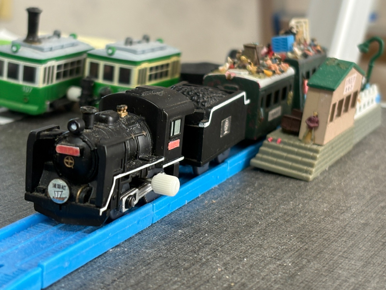 復帰後、C57は大阪ユニオン駅〜コンクリ桟橋の客貨混合列車に就いた。客車は窓ガラスの割れたままの三等車。屋根の上には荷物と共に労働者がすし詰めに乗り込み、汽笛一声でカタカタと動き出す。
