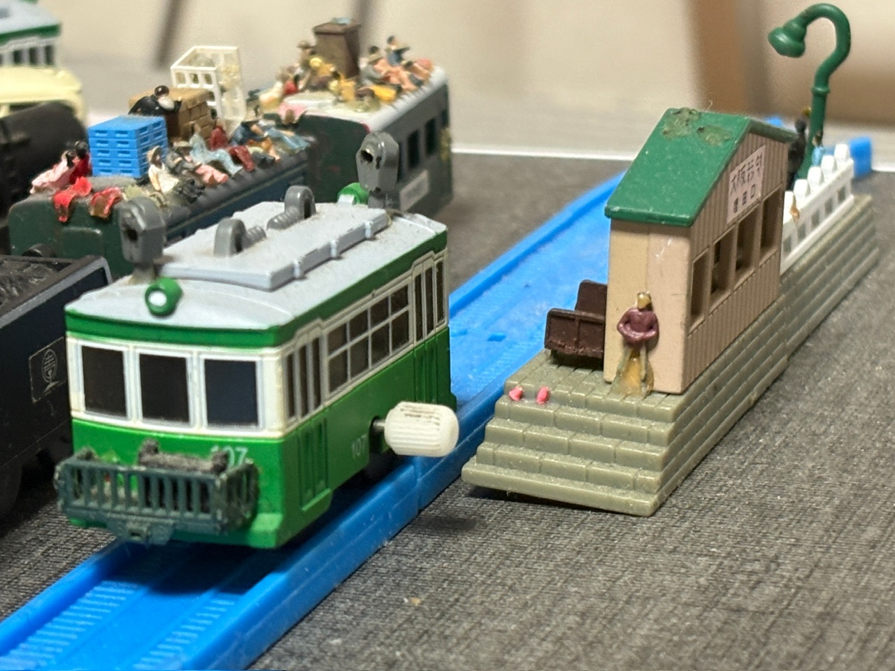 ホームの片隅で、古い緑の蓄電池動車107号が静かに唸っていた。