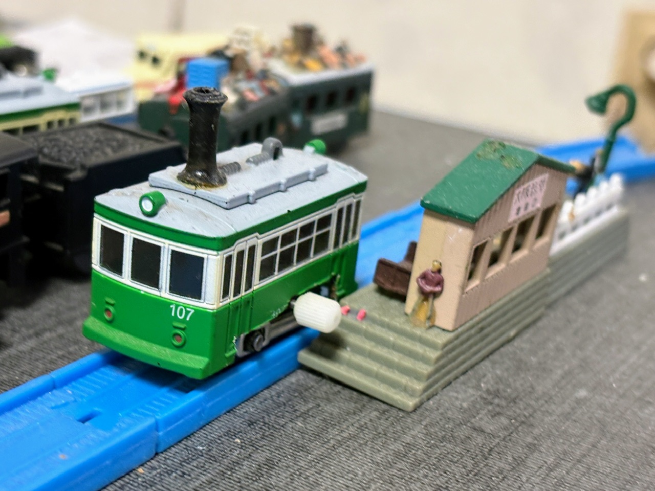 青いプラスチックの線路の上を、黒い煙突から薄く煙を吐きながら進むその姿は、どこか玩具のようで、しかし確かに「鉄道」だった。