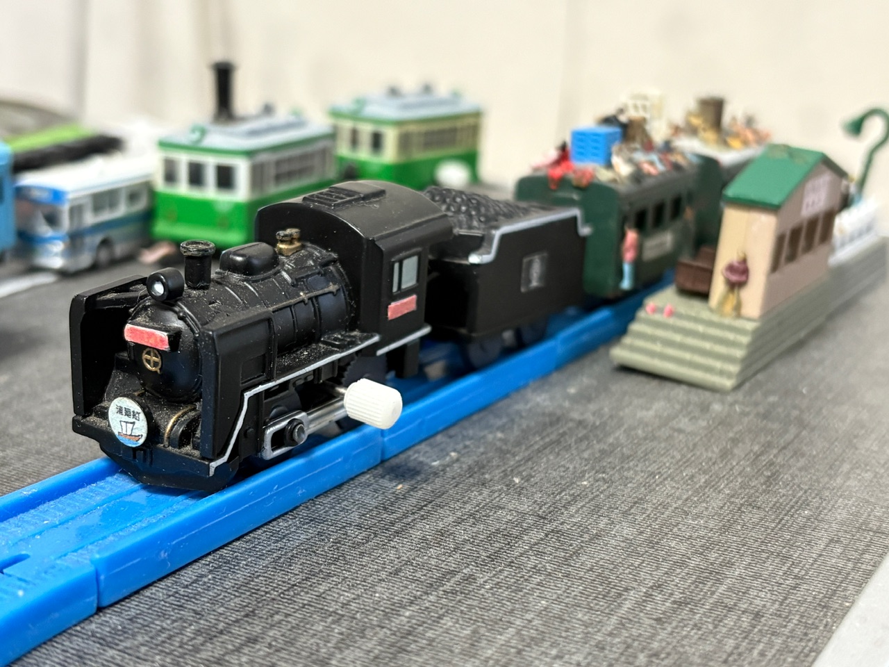 朝とも夕ともつかぬ灰色の時間帯、青い線路の上に、煤をまとったC57が止まっていた。