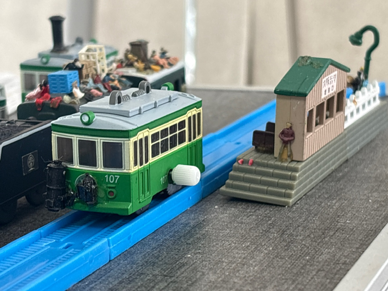 大阪ユニオン駅の片隅、害吉鉄道の引き込み線に、緑色の小さな木炭動車がちょこんと止まっていた。側面に「107」とある。屋根の上には角ばった吸気口。後ろには黒光りする木炭ガス発生装置。