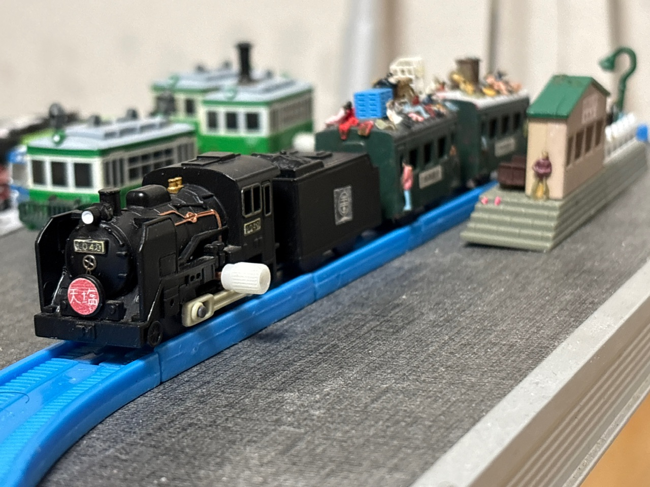 構内では緑色の古参電車たちがざわつく。